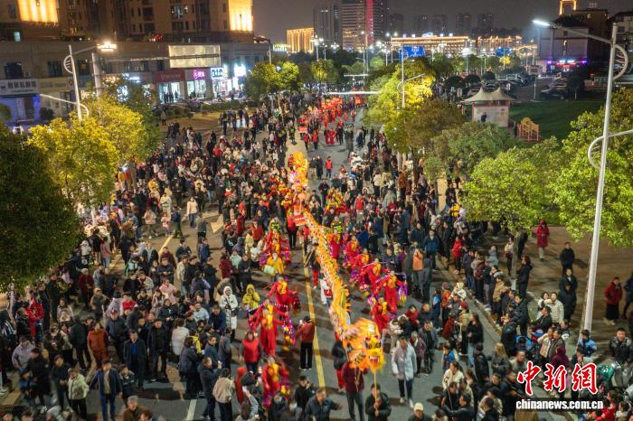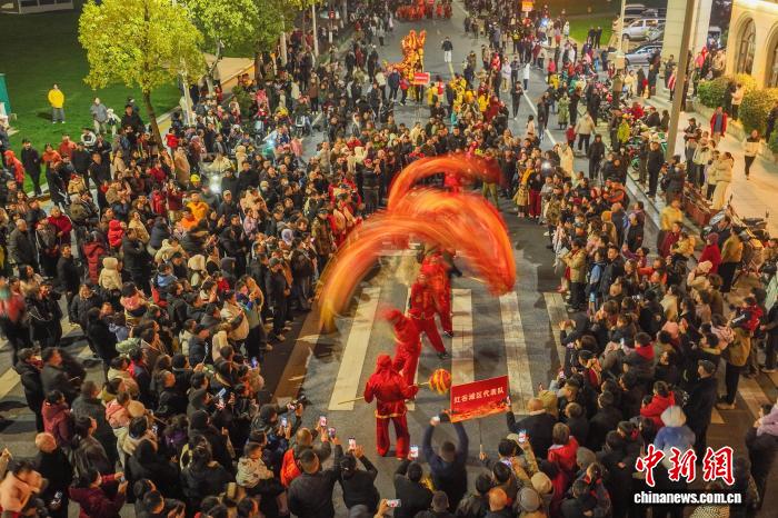 3月2日,元宵节前夜,“龙腾狮跃”迎献岁巡回举动正在江东北昌湾里办理局举办,夜色当中,1条条龙灯、板灯龙翩翩起舞,采莲舟、牙婆、蚌壳粗、渔人、浮薄花篮、北狮、扇子舞等风俗轮流演出,吸收了浩繁公众沿街旁观。图为巡回现场,出色的上演吸收浩繁公众沿街旁观。(无人机相片)中新社记者 刘力鑫 摄